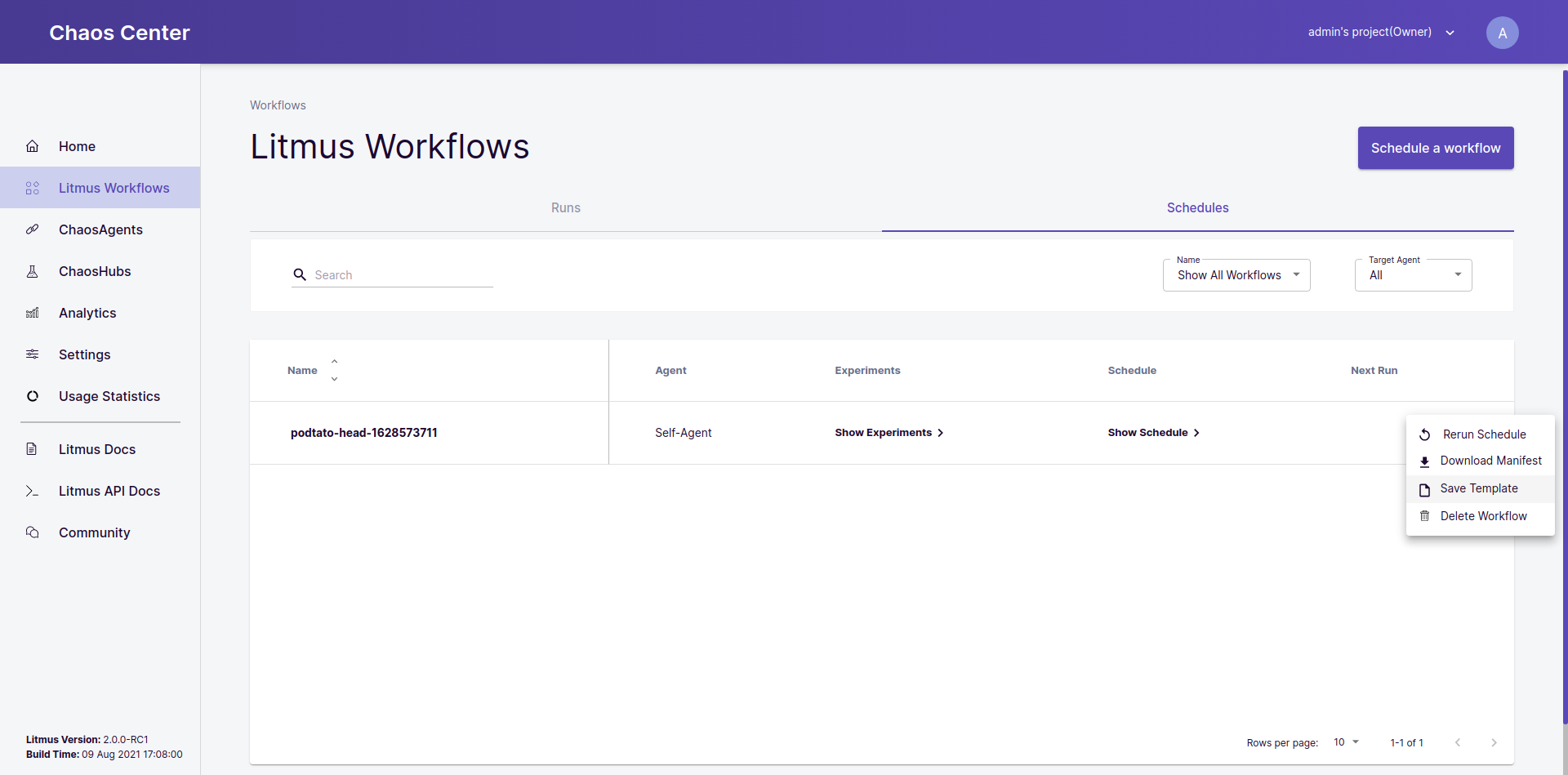 In the Chaos Scenario page, go to the Schedules tab and click on the options menu for the specific schedule you wish to save as a template: